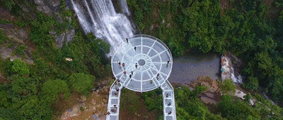 懸空玻璃平臺(tái)全長(zhǎng)202米,以72米的懸空跨度名列世界第一,為美國(guó)科羅拉多大峽谷的U形橋(21米)的3.5倍;點(diǎn)睛之筆是平臺(tái)頂部直徑16.8米的玻璃觀景圓臺(tái),這是和瀑布親密接觸的絕佳位置。圓臺(tái)中間獨(dú)具匠心地設(shè)計(jì)了網(wǎng)格狀鏤空,山風(fēng)穿透,頓生寒意;踏步其上,如墜深淵,令人心驚膽寒。
